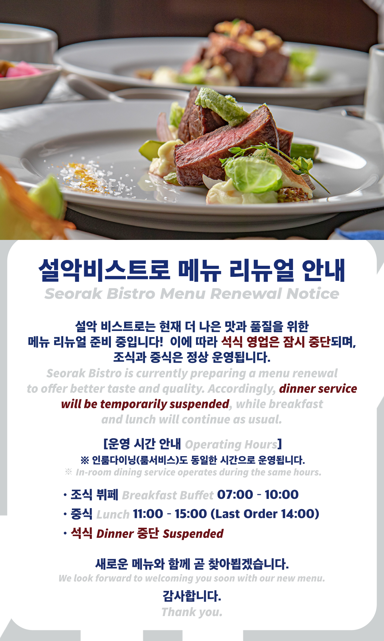- 인룸다이닝 : 11AM – 10PM (Last Order : 21:30PM)