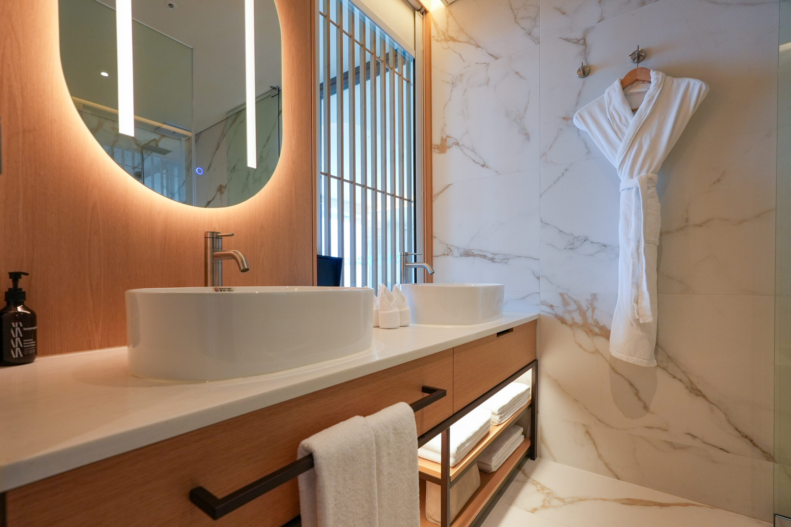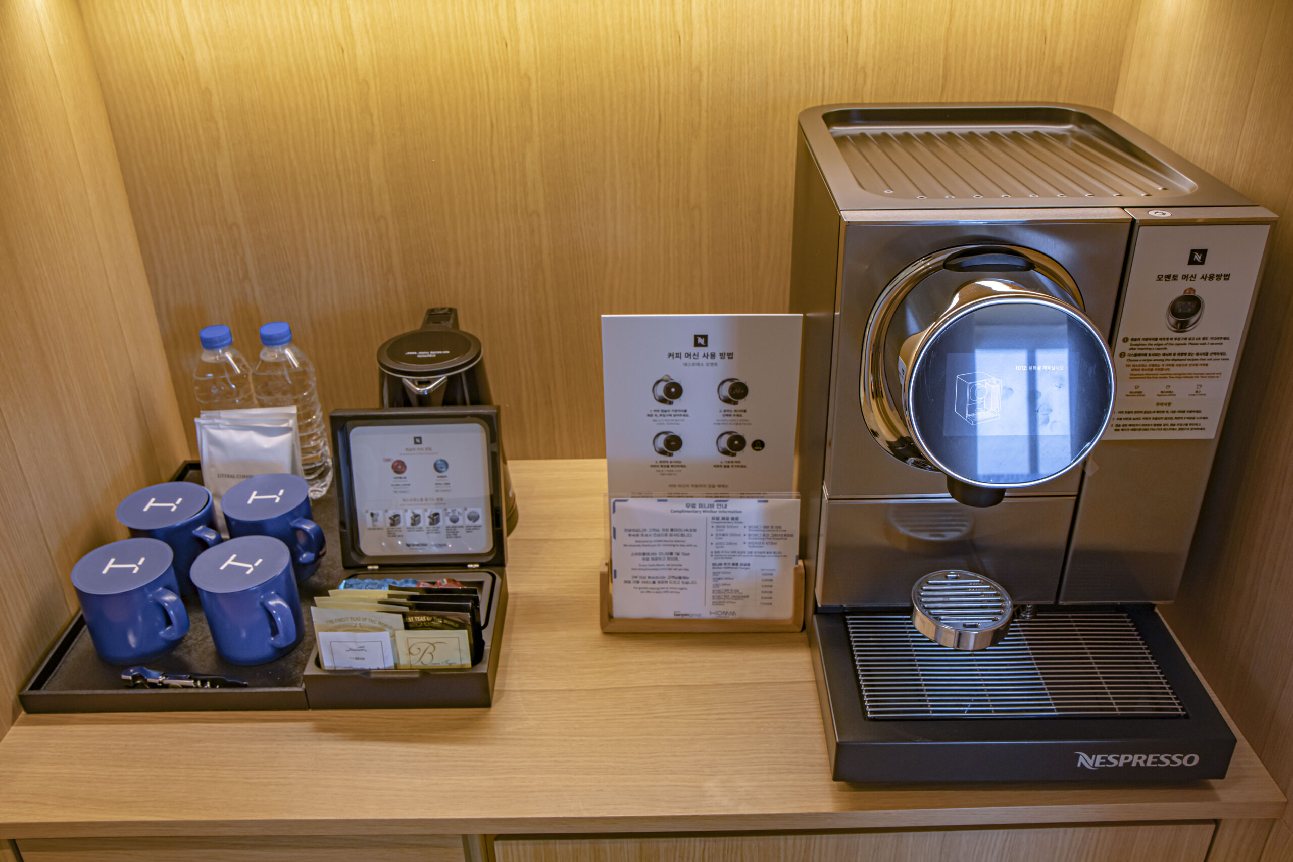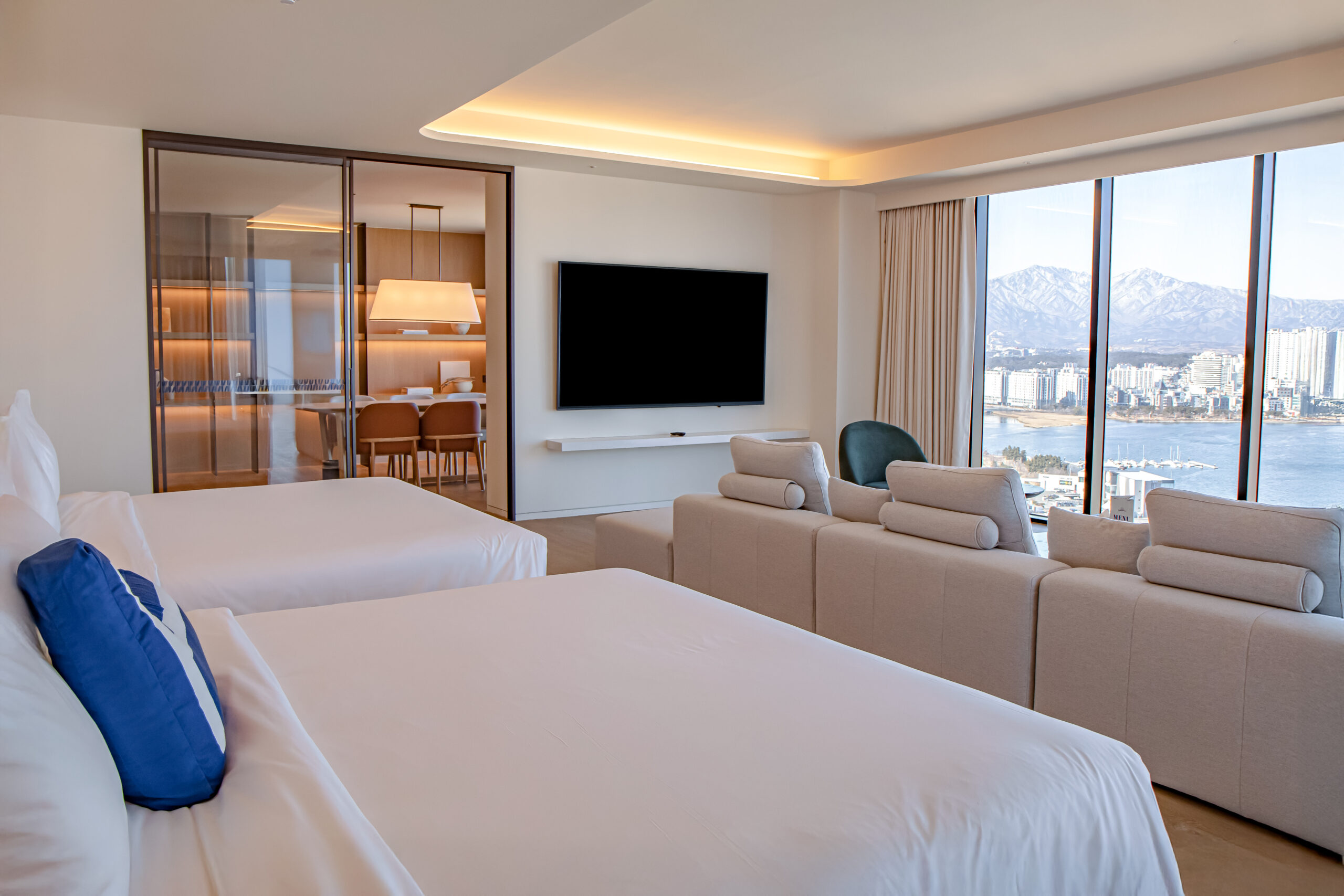 | 객실 비품 | • 에어컨 / HD TV 85인치(스마트TV, OTT 지원: 넷플릭스·디즈니플러스·웨이브·유튜브 / 개인 계정 로그인 필요) • 무료 Wi-Fi (유선 불가) • 네스프레소 픽시 머신 & 캡슐, TWG 티백, 생수 • 커피포트 • 전화기 / 책상 / 소파 • 헤어드라이어 / 구두주걱 / 개인금고 • 욕실용품 (샴푸, 린스, 바디워시, 바디로션, 핸드소프) • 목욕가운 / 코튼가운 / 슬리퍼 • 다리미(대여 가능) |